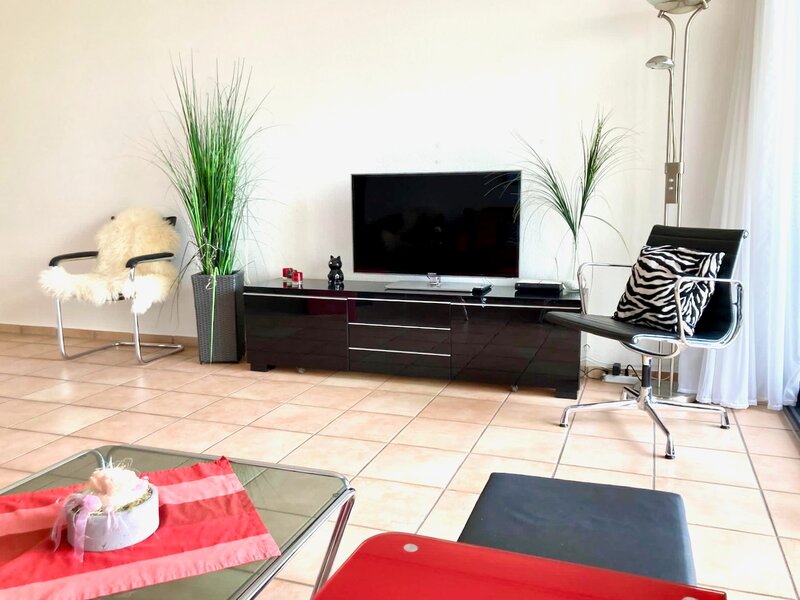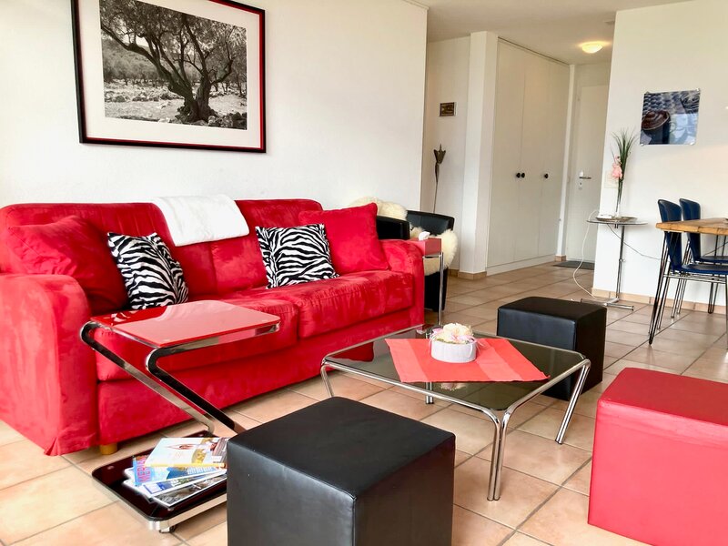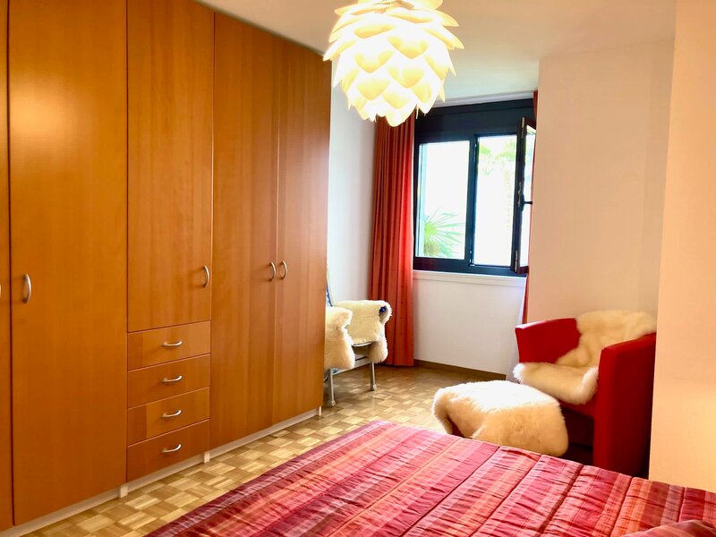 Sie verfügen über zwei Doppelzimmer mit Insektenschutzrollos, ein geräumiges Wohnzimmer mit zwei Schrankklappbetten, Sofa, Sessel, TV, WLAN und Esstisch, einen Elektro-Ofen und zwei Standventilatoren sowie eine gut ausgestattete Küche mit kleinem Frühstückstisch, Geschirrspüler, Mikrowelle, Kaffeemaschine, Toaster und Wasserkocher. Ein Badezimmer mit WC, Badewanne und Föhn sowie ein Balkon - beziehungsweise im Erdgeschoss ein eigener Aussensitzplatz - mit Sonnenstoren, ausziehbaren Wäscheleinen, Tisch und zwei zusätzlichen Relax-Stühlen runden das Angebot ab.
